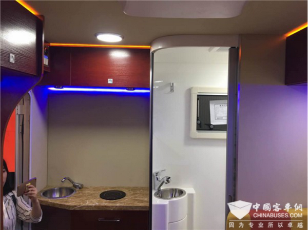 SONIC系列的车载洗手间同样坚持合理利用空间的基本原则,结合人体工程学原理,在狭小的区域内划分出独立的淋浴间、厕所和洗漱台。人性化的设计使得一天的活动过后也能尽情的享受沐浴的快感。合理的空间利用以及丰富的人性化生活配套设施另金龙礼宾车SONIC系列房车在同类竞品中脱颖而出,广受市场青睐。