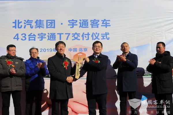 2019年2月15日,在大雪后艳阳高照的北京,43辆宇通高端商务客车T7交付北京北汽出租汽车集团有限责任公司(以下简称“北汽集团”),北汽集团董事长张峻峰、北汽集团副总经理张国栋、宇通客车国内营销副总监王文韬等领导和嘉宾出席了交付仪式。据介绍,此批交付的宇通T7将服务2019年的全国两会。