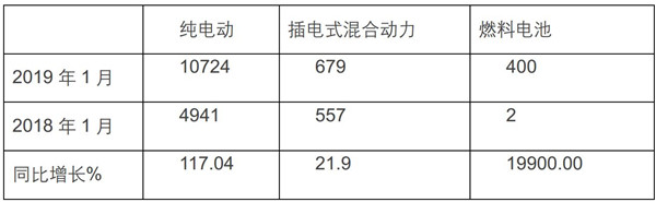 2019年1月新能源客车不同燃料类型销售情况(单位:辆,%)