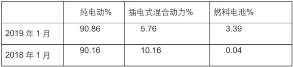 2019年1月新能源客车不同燃料类型销售份额(单位:%)