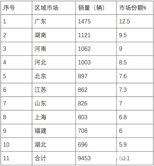 2019年1月广东、湖南、河南是销量最多的前三甲,广东最多,占据市场份额为12.5%,是市场份额唯一超过10%的销售大区。