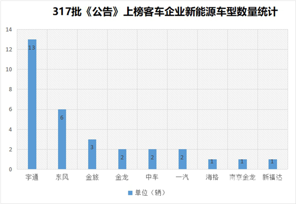其中纯电动公路客车4款,全部来自宇通。22款纯电动公交车中,唯一上榜的一款双层公交车同样来自宇通。对此,有业内人士分析称,在第316批《公告》,宇通未有新车申报次并未有新车申报,结合2019年新能源客车采购补贴未正式落地,年初购车依旧执行18年补贴政策,为获得最后的补贴“红利”,年初为新能源客车集中采购旺季,故在317批《公告》中宇通集中申报上榜的表现符合预期。