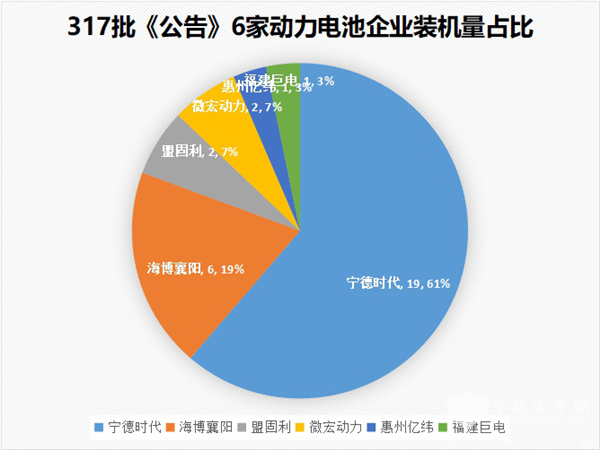 从电池品牌来看,本次入选的动力电池共自6家企业,分别为宁德时代、微宏动力、盟固利、东风海博襄阳新能源、惠州亿纬以及福建巨电新能源。其中宁德时代配套总数19款,占比达61.29%,位列榜单首位。其次是东风海博襄阳新能源,有6款车型匹配。中信国安盟固利动力和微宏动力均各2款匹配;惠州亿纬和福建巨电新能源则分别有1款匹配车型。