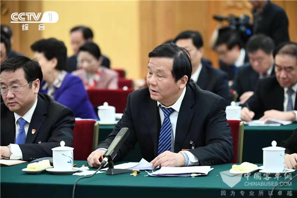 2019年3月8日上午,中共中央总书记、国家主席、中央军委主席习近平来到十三届全国人大二次会议河南代表团参加审议。全国人大代表、郑州宇通集团有限公司总裁汤玉祥作为代表,以“加快推动先进装备制造业走出去”为题,结合宇通客车近年来“走出去”的探索和实践,向习近平总书记作了汇报。