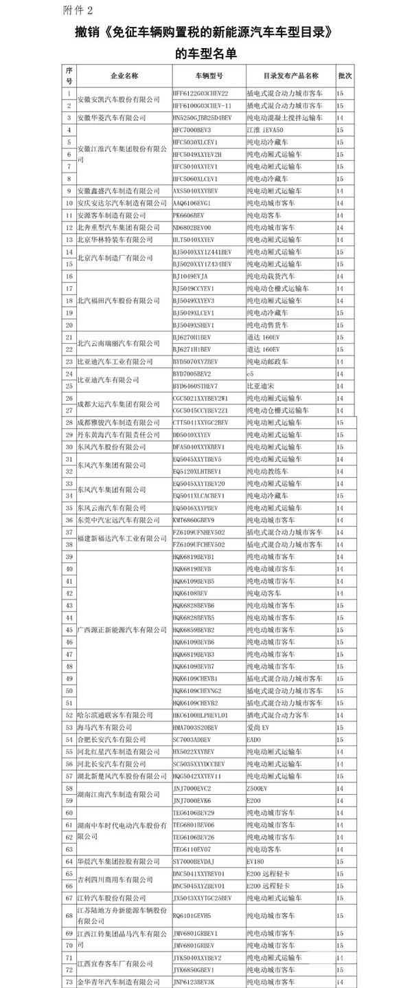 撤销《免征车辆购置税的新能源汽车车型目录》的车型名单如下: