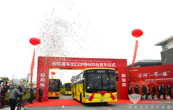 2019年4月10日,“600辆安凯客车出口沙特发车仪式”在安凯厂区隆重举行,至此,“中国客车年度出口第一大单”已经连续三年落入安凯“囊中”,安凯客车也成为了“一带一路”倡议的积极践行者和“中国制造”走向世界的典范。