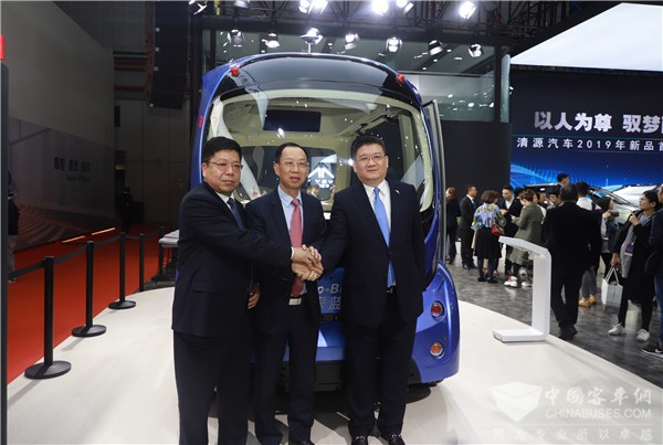 2019年4月16日,2019上海国际车展开幕,苏州金龙海格客车携手中国汽车技术研究中心、天津清源汽车共同签署无人驾驶电动巴士战略合作协议,并联合发布了三家共同研发的L4级量产无人驾驶巴士Pro-Blue“深蓝”。全国政协副主席、致公党中央主席、中国科学技术协会主席万钢等领导参观体验苏州金龙“深蓝”并与其合影留念。中国汽车工业协会顾问、中国汽车工业咨询委员会副秘书长支敏,中国汽车技术研究中心副总经理吴志新,苏州金龙总经理黄书平、副总经理邱远红、总工程师李春,清源汽车总裁祝刚、常务副总裁莊圣楷出席仪式。