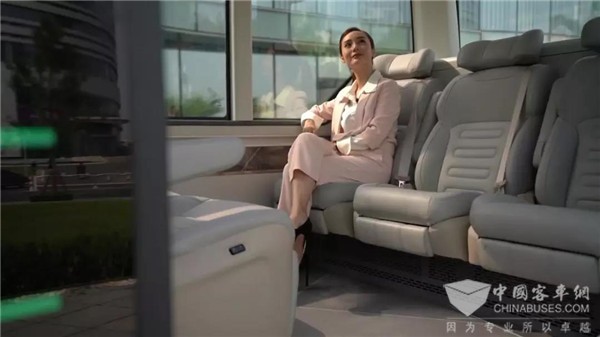 主持人展示宇通自动驾驶巴士的内饰