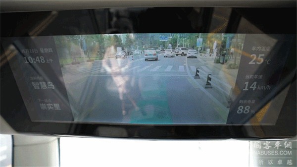 宇通自动驾驶巴士车内的AR屏幕,展示实时行驶路况