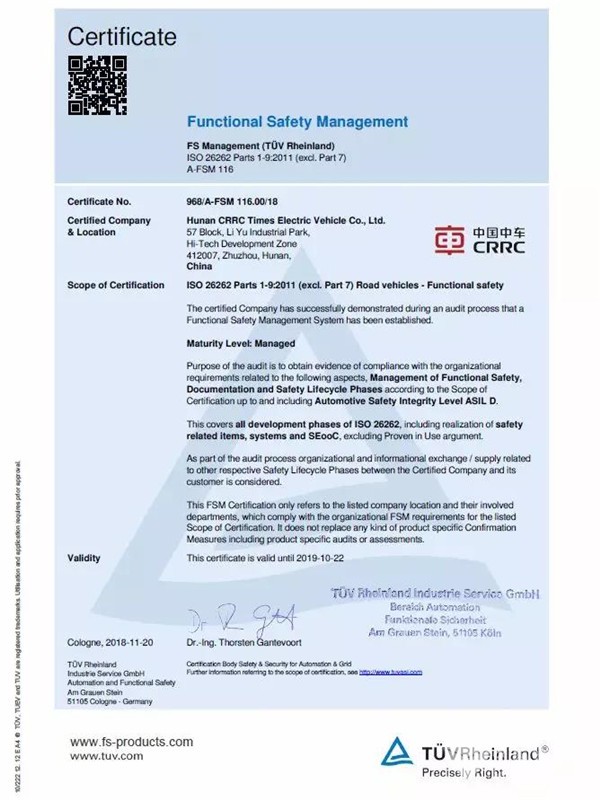在体系方面,T6基于模块化开发和自动代码生成,符合功能安全开发流程(2018年,中车电动获得德国莱茵TUV集团办法的ISO26262道路车辆功能安全管理体系认证证书,是国内首个通过该项认证的新能源商用车整车制造企业。)。系统关键参数可实现自动辨识;其新型的电机控制算法,实现了全工况范围内更快和更稳定的动态响应,更精准的转矩响应。