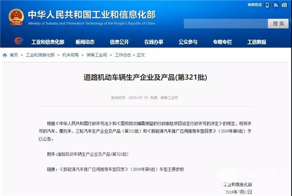 2019年7月15日,工信部发布了《新能源汽车推广应用推荐车型目录》(2019年第6批)。