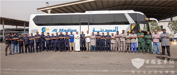 每年斋月和朝觐期的运输,是各运输企业一年中最重要的“战役”,数以百万的朝觐者在此期间蜂拥而至,加上极端炎热干燥的环境,考验的不仅是车辆的性能,还有人的体能。运营车辆几乎是人停车不停,金龙客车服务团队24小时坚守,做到全方位保障,确保车在哪里,人就在哪里。有时检查车辆至深夜或突遇沙尘暴,金龙服务人员无法返回驻地,就直接就地在服务站休息。