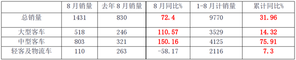从上述中通客车8月及1-8月的具体销量数据看,8月销售表现较好,在目前车市大环境低迷情况下,1-8月累计同比增长幅度较大,确实难能可贵。