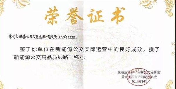近日,由交通运输部主办、中国交通报社承办的“我的公交我的城”新能源公交高品质线路推选结果在北京揭晓。永州公交22路是湖南唯一获 “全国新能源公交高品质线路”的公交线路,全国仅十条。值得一提的是,该条公交线路均采用中车电动纯电动客车。