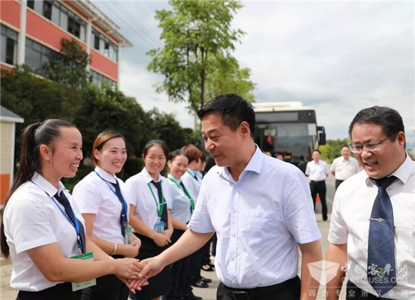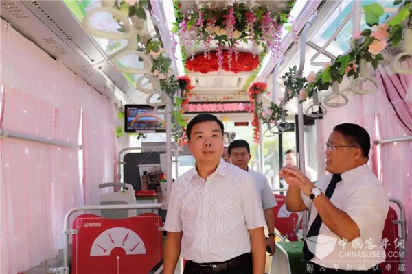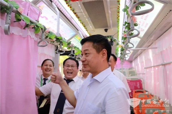 永州市市委书记严华慰问永州公交22路“巾帼示范线”,他走进公交车上,看到车长们精心布置的特色车厢文化、爱心药箱、爱心座椅、防晒窗帘后,严华书记竖起大拇指连声称赞:“好!好!确实好!”