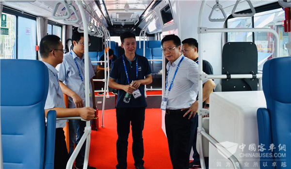 展会上,众多参展观众对熊猫智能公交车表现出浓厚兴趣,纷纷驻足参观合影留念。