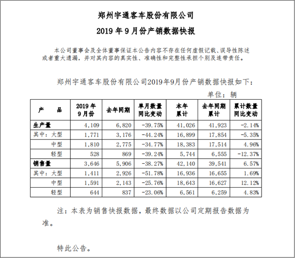 2019年10月9日,郑州宇通客车股份有限公司公布了2019年9月份产销数据快报。数据显示,宇通客车2019年前9月累计生产各型客车41923辆,同比下降2.14%;累计销售客车39541辆,同比增幅6.57%,这一表现相较8月份增幅明显放缓,这也在一定程度上反应了当前客车行业的整体产销走势。