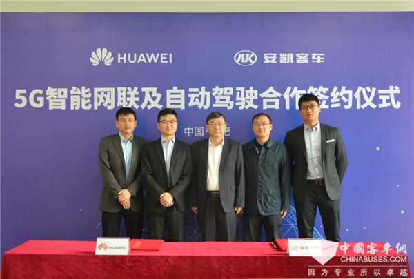 2019年10月17日,安凯客车与华为技术有限公司签署合作协议,双方将在5G智能网联及自动驾驶等领域展开全面、深入的合作。通过双方技术、资源优势互补,致力于推动智能网联、智能互联、车载计算及自动驾驶、云服务、智慧园区及5G+车联网等领域的合作创新,多方面构建客车智能解决方案,以全新合作业态推动智能交通领域的快速发展。