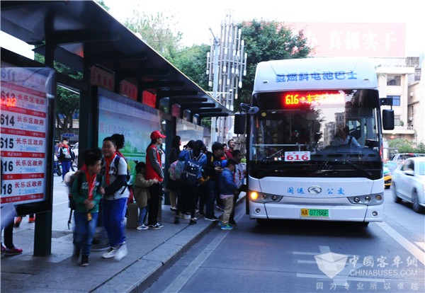 616公交线路从祥洲站始发,终点到达东安站,全程约为15km,途径 31个站点,每天行驶里程约200km。金龙客车氢燃料电池公交首发当日,众多市民迫不及待赶来尝鲜,抢先感受这一高科技产品的魅力。“行驶的时候感觉声音非常小,很安静,乘坐很舒适,而且氢燃料公交排放物为水,真正实现了零排放。”这一全新的绿色出行方式受到了市民们的欢迎和称赞。