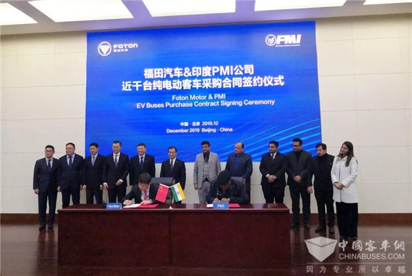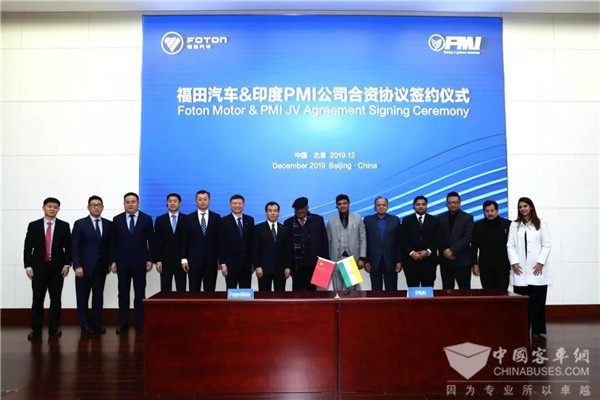 2019年12月20日,福田汽车与印度PMI合资协议签订暨纯电动客车批量采购签约仪式在北京举行。北汽集团总经理、福田汽车董事长张夕勇,北汽集团副总经理叶正茂,福田汽车党委书记、总经理巩月琼,印度PMI公司董事长萨蒂什·库马尔·耆那等中印双方高层出席。此次签约是继福田汽车与PMI公司11月在印度达成战略合作意向后,双方合资合作项目正式落地,是福田汽车新能源全球化产业布局的又一重大举措。此次又有近千台纯电动客车采购项目加持助攻,标志着福田汽车凭借在商用车新能源技术硬实力,在印属地化已全面提速,也预示着福田汽车在印度纯电动客车事业发展再度升级!