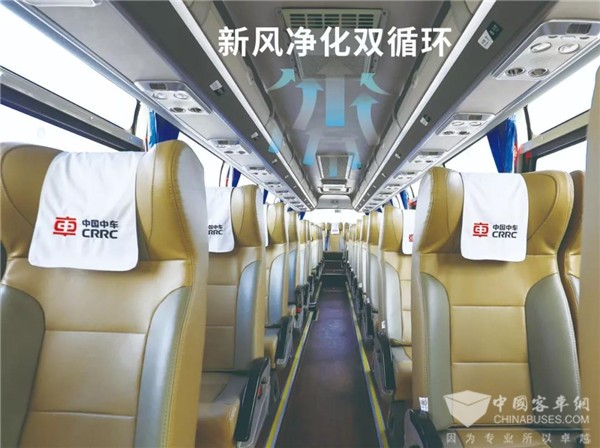 作为除醛、除菌的一把好手,中车电动采用的“双电压静电电离集尘除菌”空气净化装置,对车内空气进行净化循环,循环次数达18次/小时以上,现场除菌率高达99%;宽敞出风风道设计满足70m³车内空间的新风,符合JT/T325-2018《运营客车类型划分及等级评定》的要求,极大程度确保车辆的公众卫生安全。