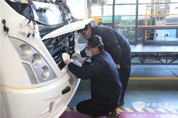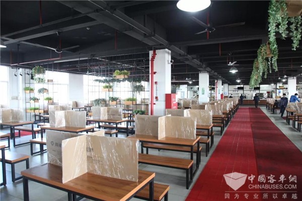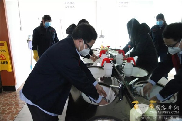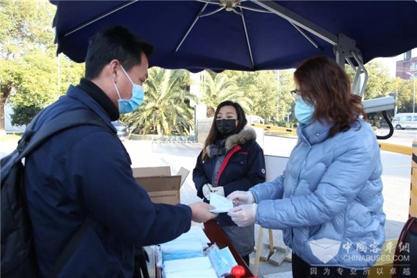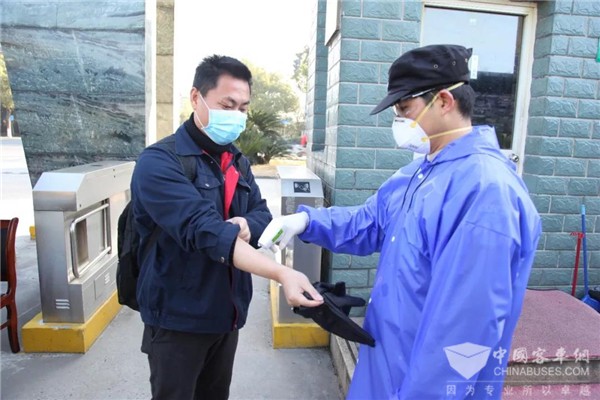 在复工首日,为保障全体员工身体健康,维护正常生产经营活动,申龙客车实行严格的疫情防控制度。每天早晨上班员工进入厂区都要佩戴口罩、进行体温测试、相互之间的接触要保持安全距离;办公区域进行消毒、保持通风;员工分散就餐,公司配备洗手液,勤洗手;厂区严控外部无关人员的进入,降低人员流动,切实保证全员员工的身体健康。
