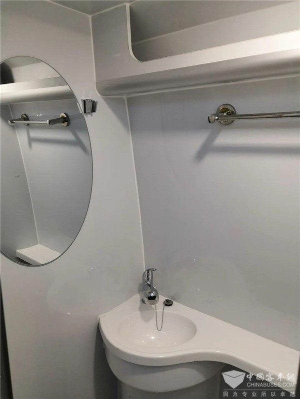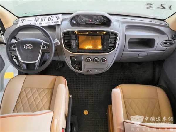 进入车内先来看看驾驶室部分。大屏导航带倒车影像。室上方配备有26寸液晶智能网络电视,让您旅行途中也不会感觉到枯燥无味。驾驶室内镀铬装饰,多功能方向盘,超迁皮料包覆的主、副座椅。驾驶体验较好,适合长途旅行。主、副座椅之间留有通道,方便身在主副驾驶的人很方便的进入后面的生活区域。