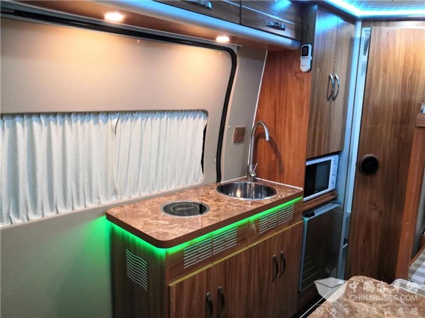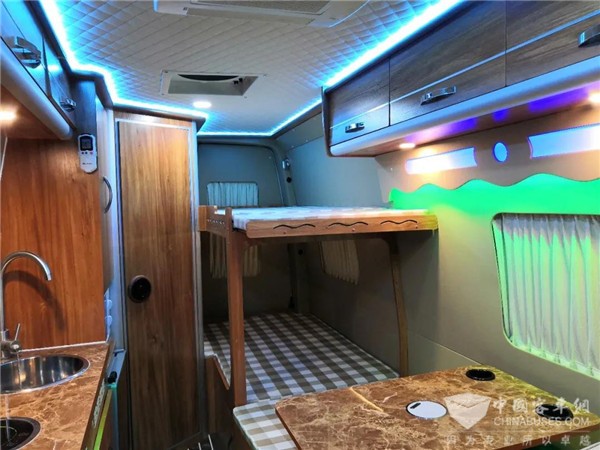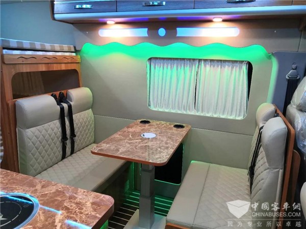 高顶的设计和通透的室内空间,让体验者不感到压抑,此款大通V80星旺房车采用的竖置上下铺后床,双人对卡座布局。对卡座设有一个手动升降桌,您可以在此与朋友畅谈,与家人谈心。