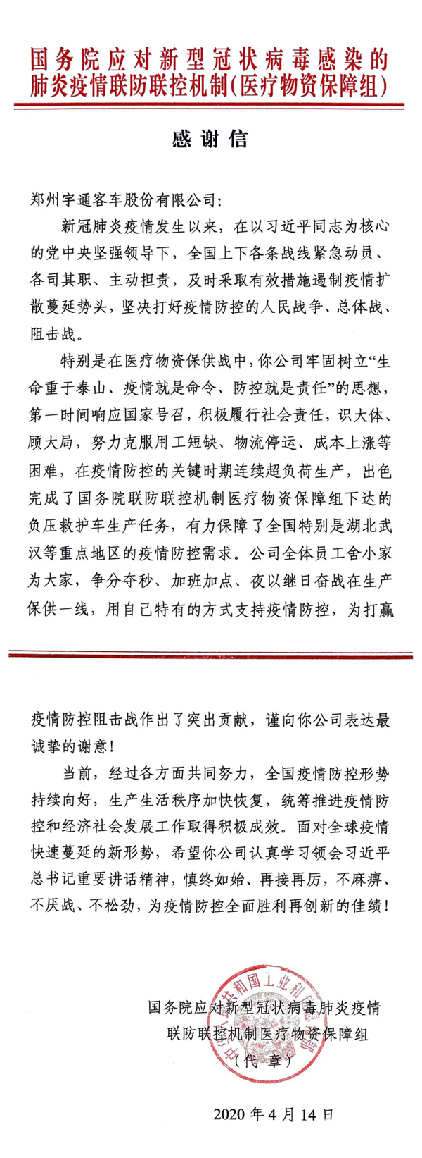 宇通收到一封来自国务院的感谢信