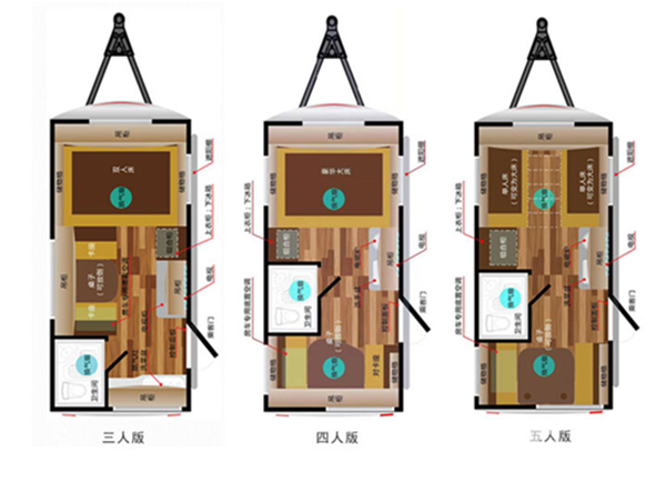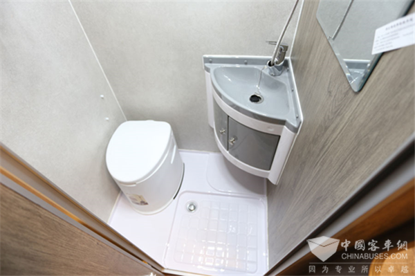 盥洗室为一体成型式,玻璃钢洗手盆,便携式马桶,抽拉一体式淋浴花洒等。