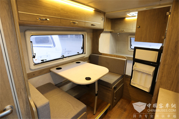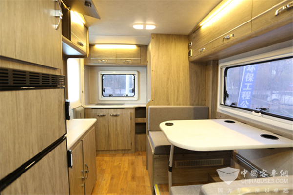 内部布局:车内采用木纹肌理环保家具,各功能区分布合理。从车厢尾门进入到车内,分布为厨房料理台,盥洗室,工作台,卡座会客区,以及主休息区和衣帽柜。