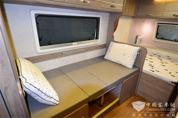 箱体前部主休息区双人大床尺寸:2*1.8m,四周设有推窗保证采光透气。
