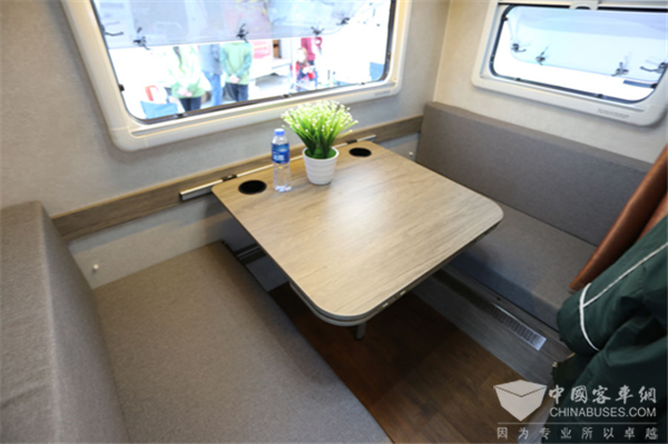 卡座会客区位于箱体后部,两张对坐式卡座沙发中间是一张折叠餐桌。