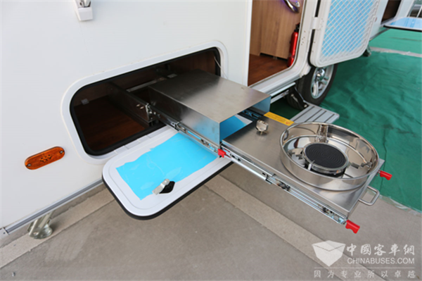 外部配置:整车为欧式风格设计,车体采用“三明治”结构,车身外部配有户外遮阳棚尺寸3.5*2.5米,带纱门的双房车专用乘客门,全车LED信号灯,车外LED照明灯,外置淋浴器,车前部大空间行李舱,车尾洗车把手,车底部支腿等。
