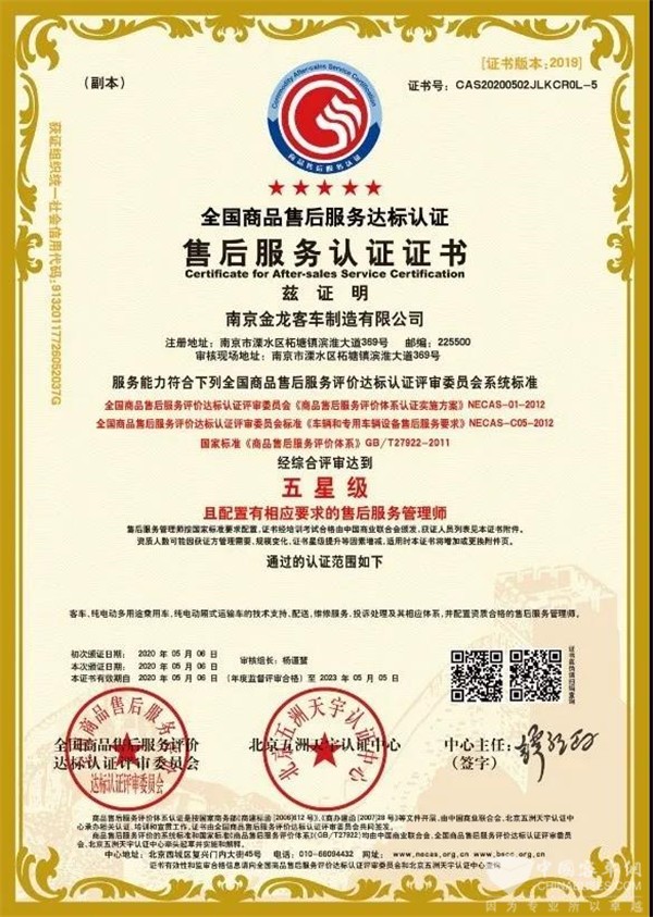 售后服务评价认证是以《商品售后服务评价体系》国家标准为依据,用于客观反应企业售后服务工作的现实状况,准确衡量企业售后服务的实际水平。南京金龙售后服务获得五星级认证,证明公司售后服务不但能保证为用户提供完善的售后服务,更在行业中起到了领头作用。