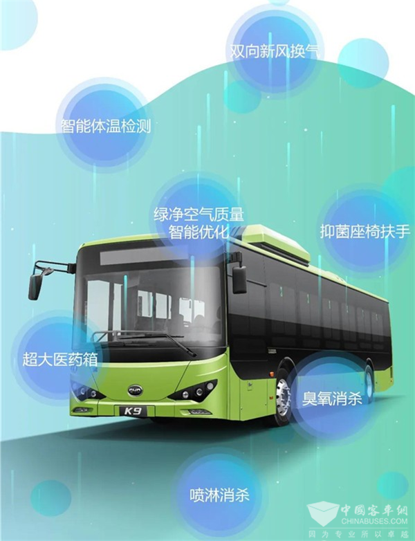 比亚迪客车创新研发设计,在上客门处搭载非接触式智能体温检测系统,通过红外热成像技术实时监测上车乘客体温,并实现测量数据的存储和上传。比亚迪客车还将具有长效抗菌功能的原材料应用到车内可接触物(如座椅、窗帘、地板、扶手等)中,降低交叉感染风险。为持续优化车内环境,比亚迪客车采用多级空气过滤+多种除菌消毒措施,搭载双向车内新风换气技术,仅用7-8分钟就可实现整车换气。此外,车内配备大容积医药箱,可存放手持式电子体温计、消毒喷壶、医用口罩、医用手套、碘伏等应急药品,方便司乘人员快速对车内进行消毒防疫和二次消杀,实现多重防护以保障运营效率及车内乘客安全。