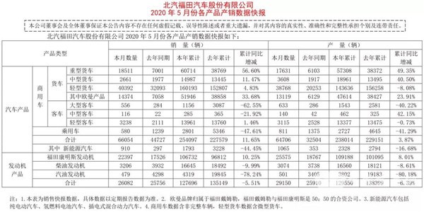 据福田汽车2020年6月3日发布的公告显示,5月份,福田销售各类汽车(含商用车和乘用车)66054辆,同比增长47.68%;生产各类汽车64706辆,同比增长99.07%。1-5月,福田累计销售各类汽车254097辆,同比增长11.65%;累计生产各类汽车238014辆,同比增长3.87%。
