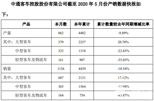 2020年6月5日,中通客车控股股份有限公司发布2020年5月份产销数据自愿性信息披露公告。公告显示,2020年5月,中通客车销售各类车型1136辆,同比增长0.35%;生产各类车型862辆,同比下降28.64%。1-5月,中通客车累计销售各类车型4439辆,同比下降10.54%;生产各类车型4482辆,同比下降9.89%。