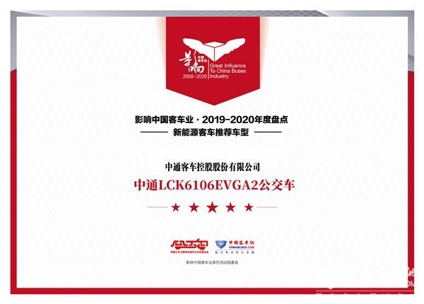 中通LCK6106EVGA2摘得2019-2020年度“新能源客车推荐车型”奖项