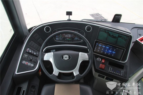 驾驶区,采用环抱式仪表台设计,便于驾驶员的操作,提升驾驶舒适性和可靠性。全车配有多个电子后视镜和摄像头,可以实现360°环视监控,配合L2级智能驾驶,安全性能有所提升。驾驶室护栏采用全包围结构,上部高透光率玻璃材质,不会阻碍驾驶员视野,可有效降低车内环境对驾驶员的干扰,保障车辆运营时的行驶安全。