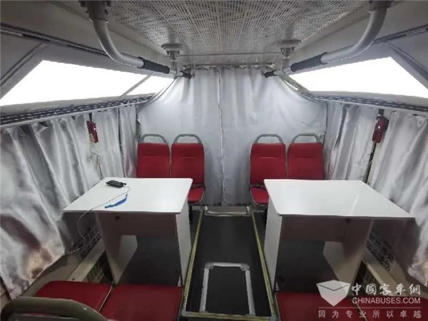 “核酸检测采样车”能够让医护人员如此高效的进行核酸检测工作,更多的是得益于科学的空间布局。其车辆的内部空间划分为驾驶监控区、核酸检测采样工作区、医护人员休息区三大部分,与其便利性、安全性、人性化设计相辅相成。
