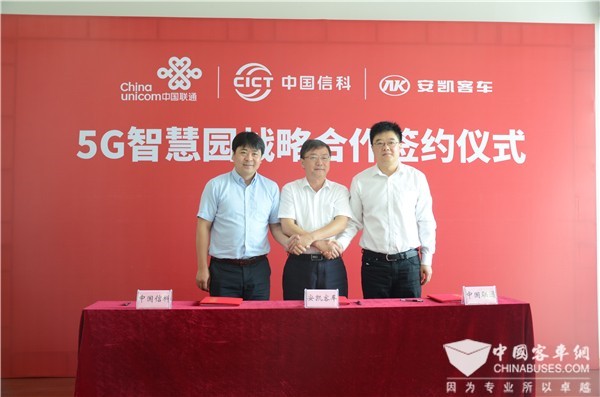 2019年9月29日,安凯客车与中国信科、中国联通就共建5G智慧园签订三方战略合作协议,三方通过强强联合和技术优势互补融合,致力于推动5G技术在客车领域的实际应用,实现自动驾驶与5G技术的快速融合,共同打造5G智能交通的应用场景。