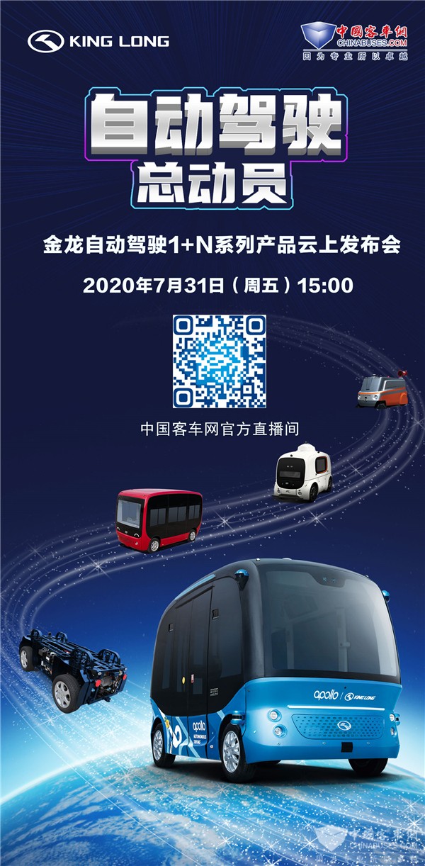 干货满满,惊喜不断。2020年7月31日(周五),下午15:00, 自动驾驶总动员--金龙自动驾驶1+N系列产品发布会线上等您!