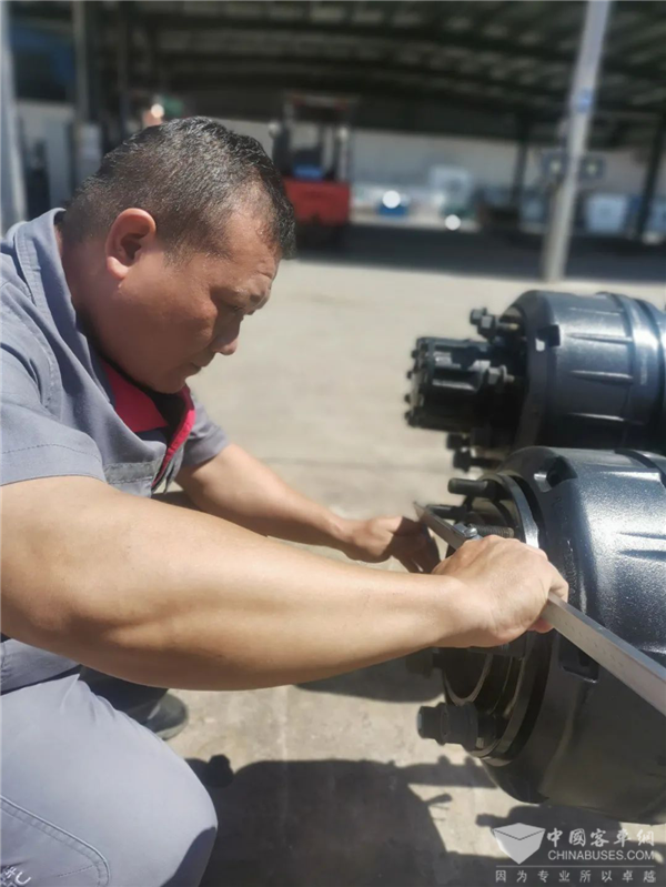 刘亮平正在对车桥进行检验工作,此批中午卸货的车桥,下午车间急需进行装配,“刘哥哥”急急忙忙的吃完中饭就顶着烈日开始工作,不放过每一个尺寸,认真检查每一处细节,满头的汗滴顺着脸颊滴在地上。每一项内容,每一处场景,都体现着他们无惧酷暑的拼搏精神。