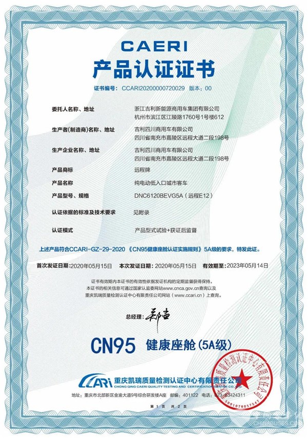 此外,远程E12还在今年上半年通过了“健康座舱”的全部五项认证——清新空气、抗菌防霉、健康选材、电磁洁净、低噪隔音,被中汽研授予“CN95健康座舱5A级”证书。