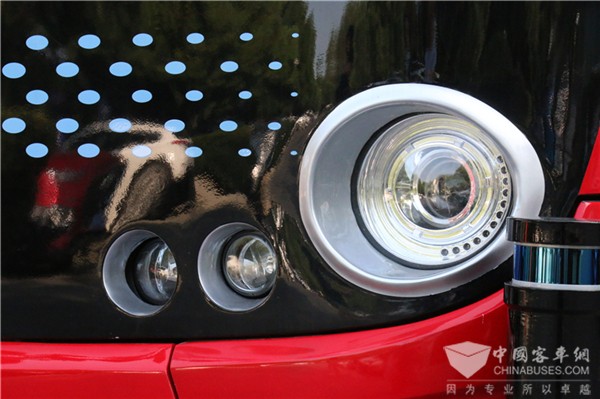 外观上看,这款安凯自主研发的无人驾驶客车“颜值”绝对在线。经典的红、黑车身配色、圆润的线条造型设计、配合两大、四小布局圆形前大灯,萌态十足。车辆前脸采用纯电动车型特有的全封闭格栅设计,点缀横向排布淡蓝色“满天星”涂装,让它充斥着客车产品中鲜有的“科技感”。
