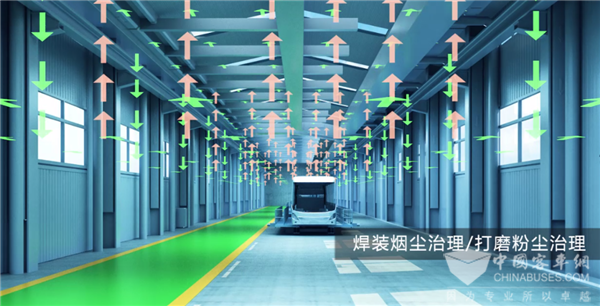 焊接车间采用先进的新风净化系统,净化后的空气根据季节不同排风或通过表冷段循环。车间设置焊缝打磨室,新风经顶部送风夹层湿膜降温系统后,由送风口均匀送入打磨室内,含尘气流经过底部管道抽到除尘主机经处理后排放,可确保室内洁净的工作环境,夏季可降低车间室内温度5℃以上,大大改善员工作业环境。