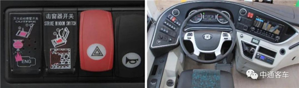 配备应急疏散系统,在按下应急疏散键后,发动机熄火,2秒后断开整车电源,开启应急疏散指示灯,车速迅速降到5km/h,车门自动打开;在遇到紧急情况时,只需按下开关,自动击窗器就瞬时启动打碎玻璃,以便车内人员迅速撤离。
