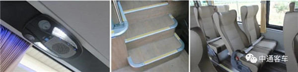 安装可侧移豪华座椅,可调扶手、靠背,为不同身高体型的乘客提供舒适的乘坐体验;座椅配有脚踏和网兜,缓解长时间乘坐带来的疲劳;从驾驶区到乘客区分为三级踏步,每级都有灯光,提高安全性,充分照顾到老年人和儿童的乘车便利性。
