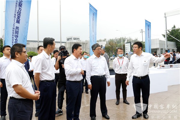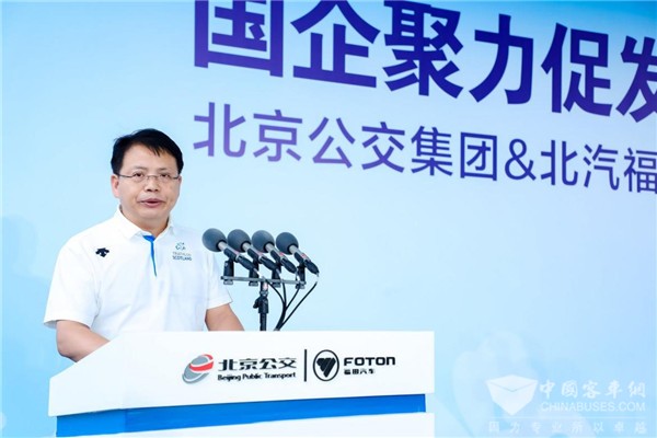 北京市国资委一级巡视员翟贤军, 昌平区政府党组成员、副区长董贵蛟,昌平区经济和信息化局副局长高克瑶,北京公交集团党委书记、董事长王春杰,北京公交集团党委副书记、总经理朱凯,北汽集团党委书记、董事长姜德义,北汽集团总经理、北汽福田董事长张夕勇,北汽集团党委常委、副总经理蒋自力,北汽福田党委书记、总经理巩月琼等领导及媒体出席活动,共同见证北汽福田与北京公交集团聚力共赢,持续扩大和深化在新能源客车领域的合作,携手守护北京蓝天,助力首都经济发展“不退不让”,实现生态环境高水平保护和经济高质量发展的双赢。